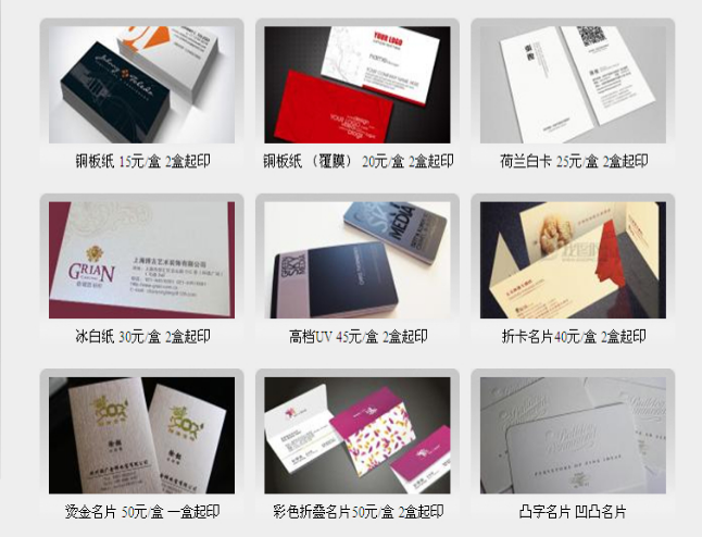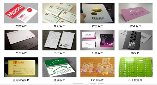 印刷工藝:名片圓角、凹凸名片、折疊名片、燙金名片、燙銀名片、凸字名片、異型名片。